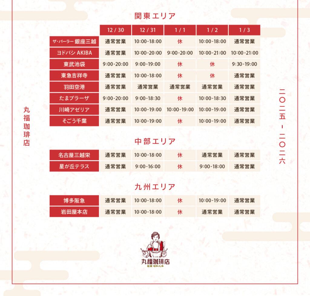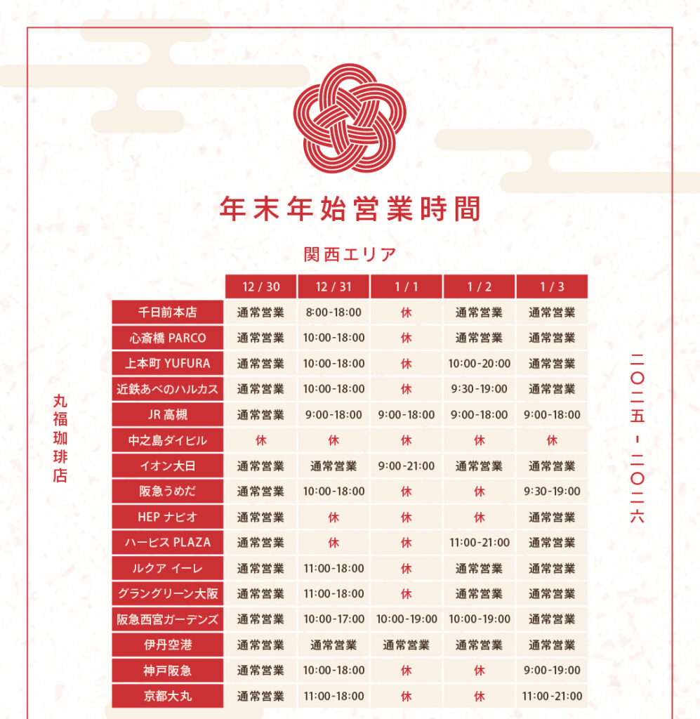 【 年末年始 】2025-2026 営業時間のお知らせ ※予期せず変更となる場合がございます。※ 中之島ダイビル店は2025年12月27日から2026年1月4日まで休業いたします。※ 東武池袋店は2026年1月4日は10時から19時までの営業となります。